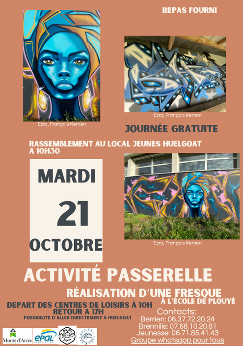 Les deux centres de loisirs de Berrien et de Brennilis, le service d'animation jeunesse et la base de loisirs du territoire s'associent pour proposer aux enfants et aux jeunes une journée d'animation commune : la réalisation d'une fresque sur les murs de l'école de Plouyé !