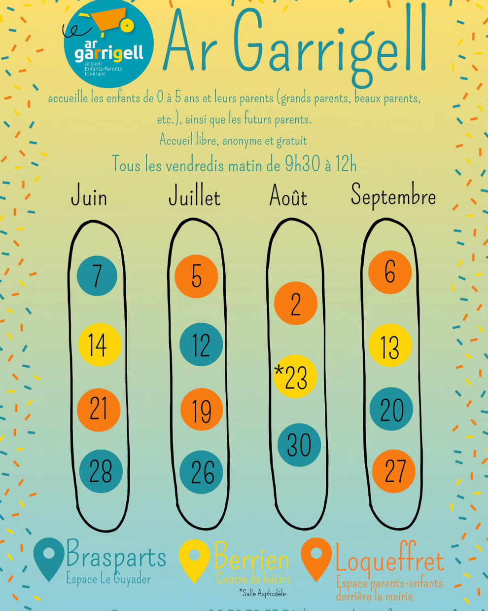 Ar Garrigell, accueille les enfants de 0 à 6 ans accompagnés d'un adulte (parent, grand-parent, beau-parent, etc.), et les futurs parents, chaque vendredi de 9h30 à 12h00, en alternance sur trois communes : Berrien, Brasparts et Loqueffret.