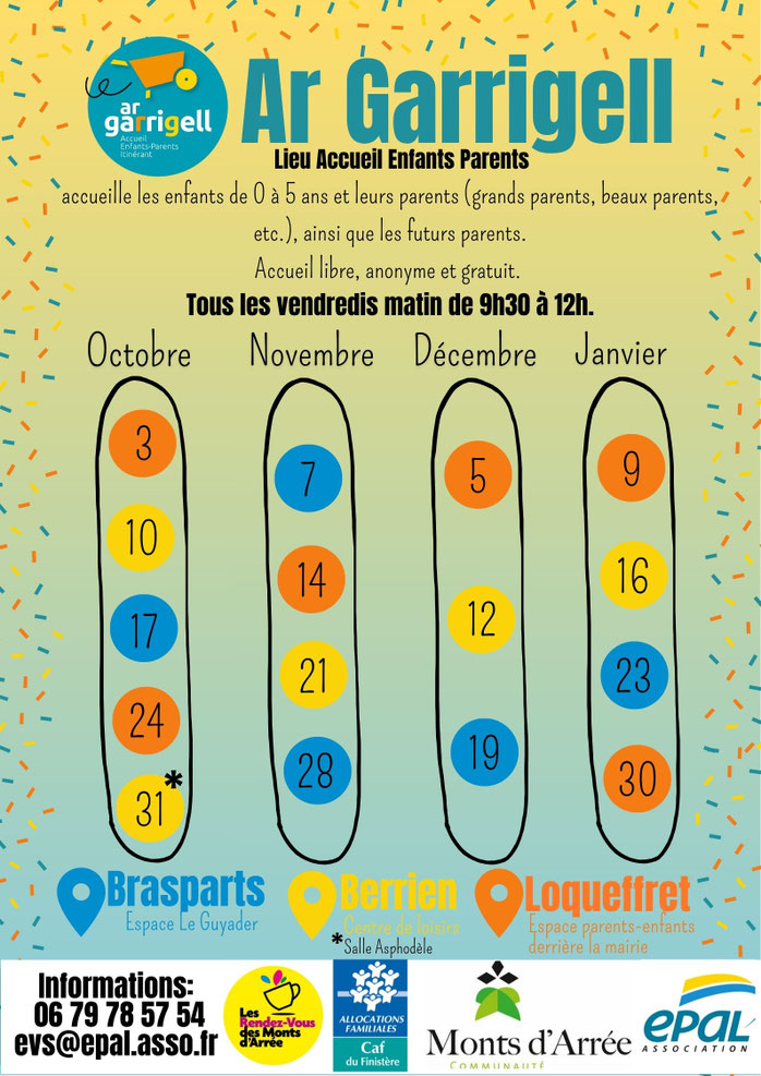 Ar Garrigell, accueille les enfants de 0 à 6 ans accompagnés d'un adulte (parent, grand-parent, beau-parent, etc.), et les futurs parents, chaque vendredi de 9h30 à 12h00, en alternance sur trois communes : Berrien, Brasparts et Loqueffret.